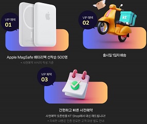 - KT에서 아이폰 4회 이상 가입한 아이폰 마니아 인증 시 애플 맥세이프 배터리팩 500명, 출시 당일 배송 보장 혜택