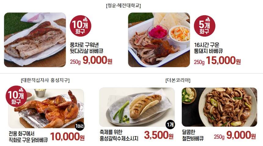 | 메인 바베큐 존 | 일시 : 11.03.(금) ~ 11.05.(일) 10:00 ~ 21:00 장소 : 홍주읍성 여가문화공간 진행 : 더본코리아, 청운대, 혜전대 바베큐시설 : 모둠 바베큐 10개, 통돼지 바베큐 10개, 닭고기 바베큐 10개 진행사항 : 바베큐 해체쇼 및 바베큐 퍼포먼스 진행 볼거리 / 더본코리아와 지역대학생 협업 운영 |